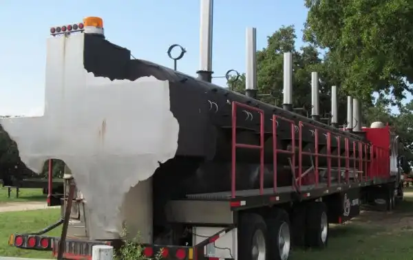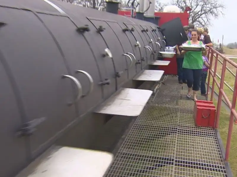 Терри Фолсом из Техаса любит барбекю, как истинный американец. Вот только приготовление мяса на гриле - довольно хлопотное занятие, когда в одном месте собирается больше десятка человек. Поэтому народный умелец попыхтел немного и создал передвижной гриль, на котором можно одновременно жарить четыре тонны мяса.