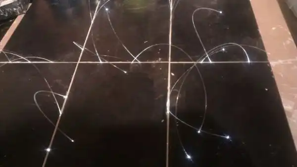 Подумайте, какой степени звёздности пол вы хотите получить (для этого нам и нужен был тестовый образец). Теперь разрежьте оптоволокно на отдельные нити, разделите на соответствующие пучки, и разложите их по полу. Помните, что их длина должна быть немного больше, чем путь из соответствующей точки вашего пола к источнику света. Например, если самая дальняя точка находится на расстоянии четырёх метров от источника света, я добавлял к ним около 30 см.