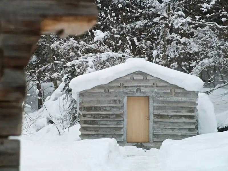На первый взгляд это классический бревенчатый домик. Однако при более детальном рассмотрении становится ясно, что вместо дерева его основу составляют монолитные бетонные стены. Таким образом, использовав типично «городской» стройматериал для хижины, архитекторам удалось удачно «вписать» ее в природный пейзаж.