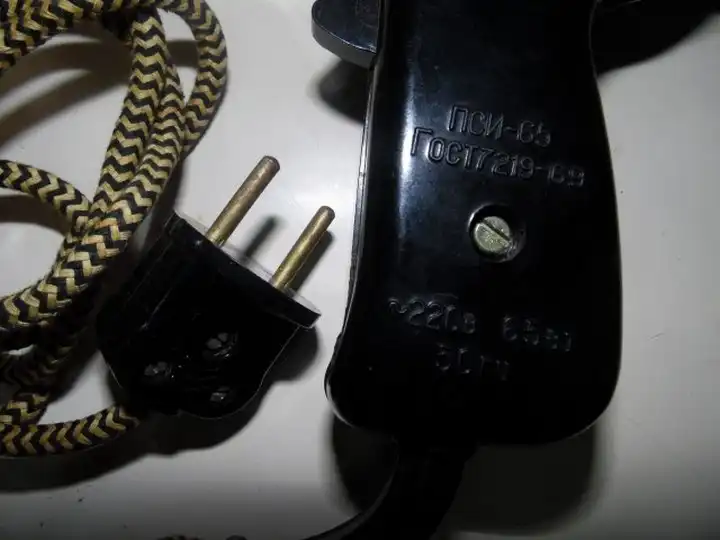 Как видно ГОСТ аж 69 года, меня тогда и в планах не было. Характеристика 220В, 50Гц, 65 Вт, только почему-то написано всё маленькими буквами. Шнур прикольный, он по моему плетеный из ниток, ну а сетевая вилка просто шикарна )