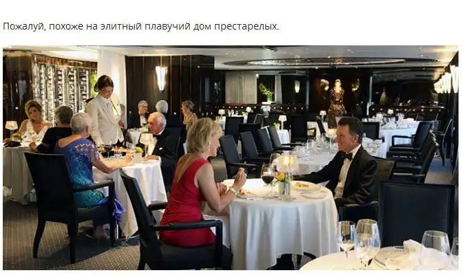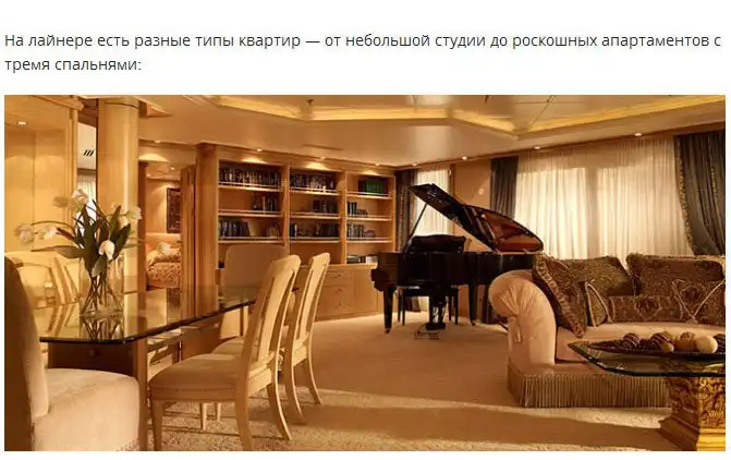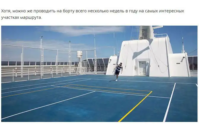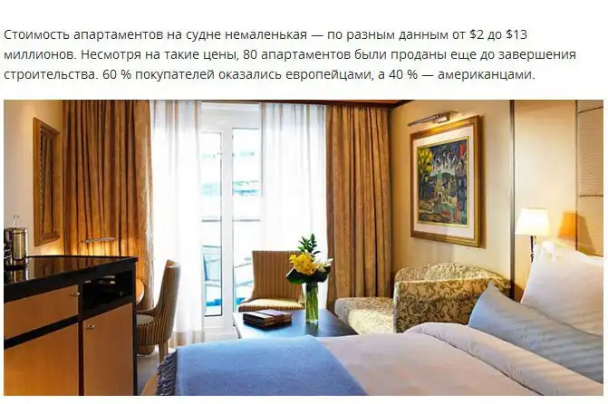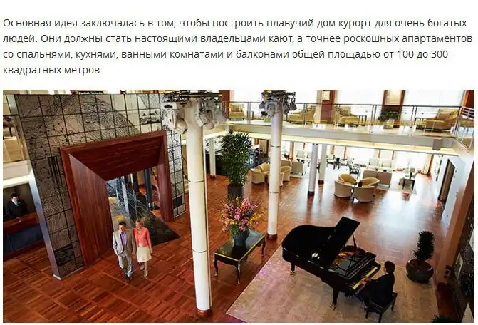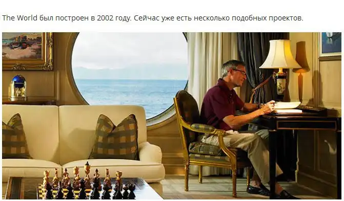 Круизный лайнер The World представляет собой уникальный жилой дом на плаву. На борту судна расположено более 100 квартир класса люкс, а всех пассажиров здесь называют «жильцами». Весь год корабль находится в кругосветном плаванье, заходя в порты различных городов мира, чтобы дать возможность владельцам дорогих квартир посетить различные светские мероприятия.