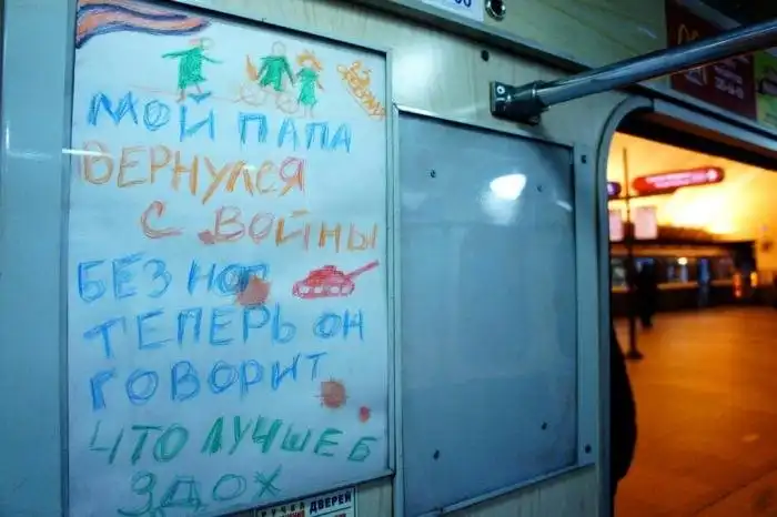 23 февраля в вагонах метро Санкт-Петербурга местные активисты расклеили антивоенные плакаты, оформленные в виде детских историй и рисунков. Фотографии этих плакатов опубликовали пользователи соцсетей.