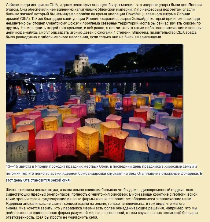Сейчас о последствиях ядерной бомбардировки японских городов Хиросима и Нагасаки вспоминают довольно редко, что не дает людям в полной мере оценить масштаб бедствий в случае ядерной войны.