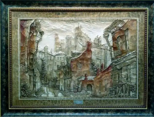Мало того, что сделаны они аккуратно, с хорошей перспективой, игрой планов, так они еще имеют свою узнаваемость. А это уже верный признак мастерства художника – свой стиль. Сразу скажу, что размер большинства работ с рамой – 60-90см. Некоторые картины режутся месяцами. В настоящее время в мастерской накопилось около 200 композиций и эскизов авторских работ.