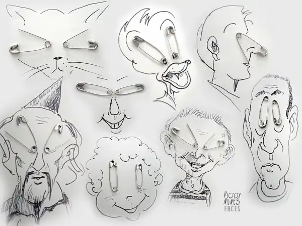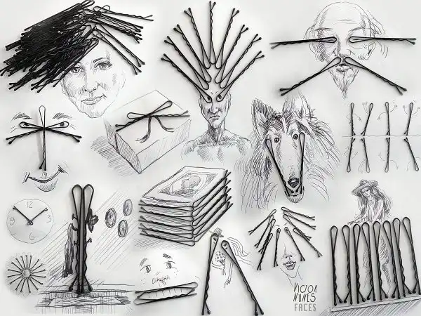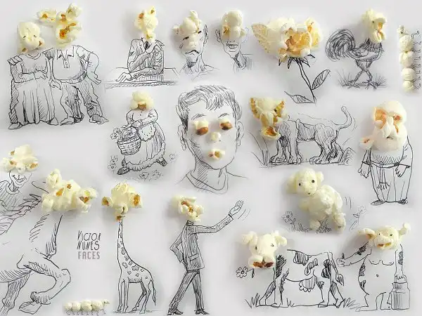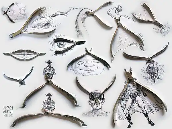 Для каждой серии рисунков Виктор Нунес берет какой-то один предмет и создает с ним целую серию зарисовок. Чаще всего он использует продукты питания: попкорн, тыквенные семечки, кукурузу, соломку и др. Например, половинки грецкого ореха в руках мастера становятся и головой тигра, и крыльями ангела, и даже курами на вертеле. Популярностью у художника пользуются и канцтовары, особенно «продуктивны» ножницы и скрепки. Он также неравнодушен к смятым фантикам от конфет, винным пробкам, монетам, чашкам и многому другому.