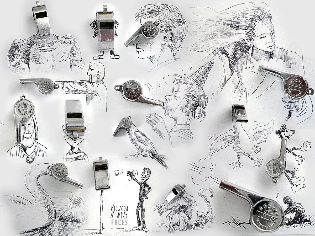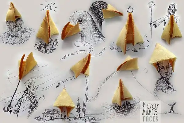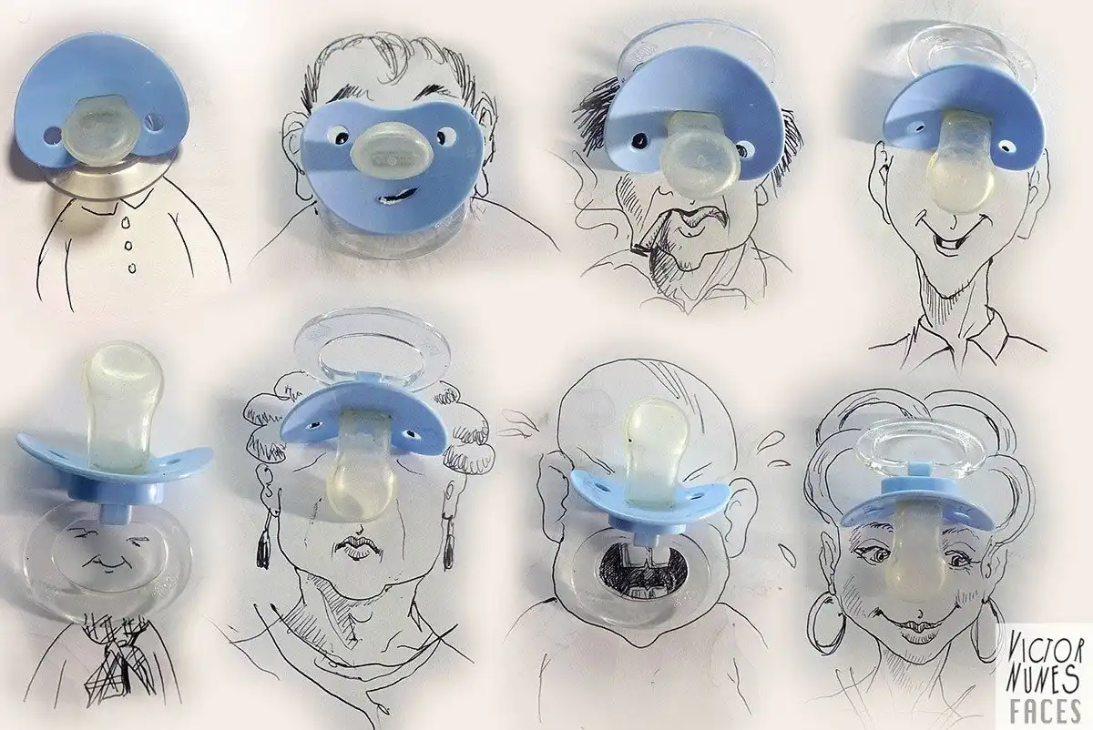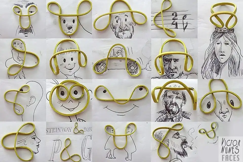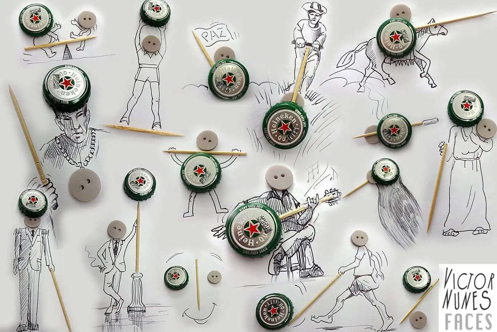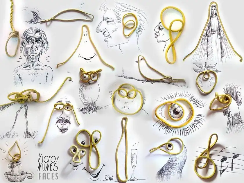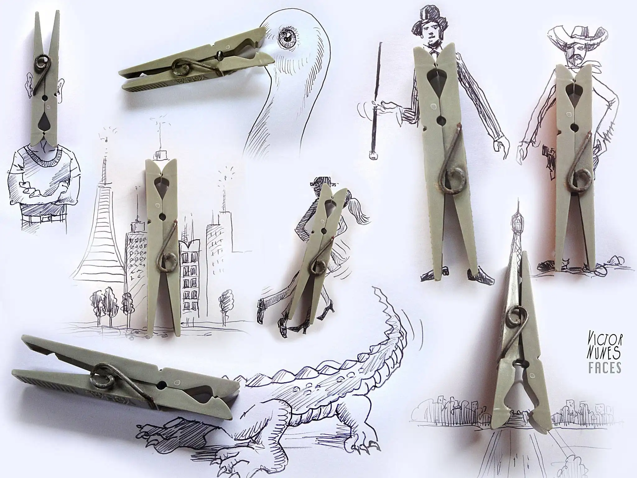 Виктор Нунес обладает отличны чувством юмора: предметы, разбросанные по листу бумаги, тут же «обрастают» дополнительными деталями, превращаясь в масштабные композиции. Кстати, художник прославился не только благодаря своим рисункам-миниатюрам, но и скульптурам из шоколада, которые он ранее создал для «съедобного» сайта португальского бренда «Sagres».