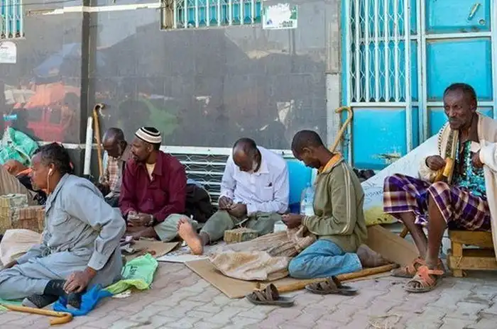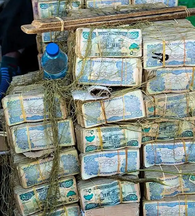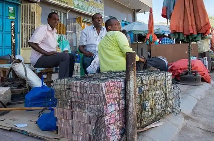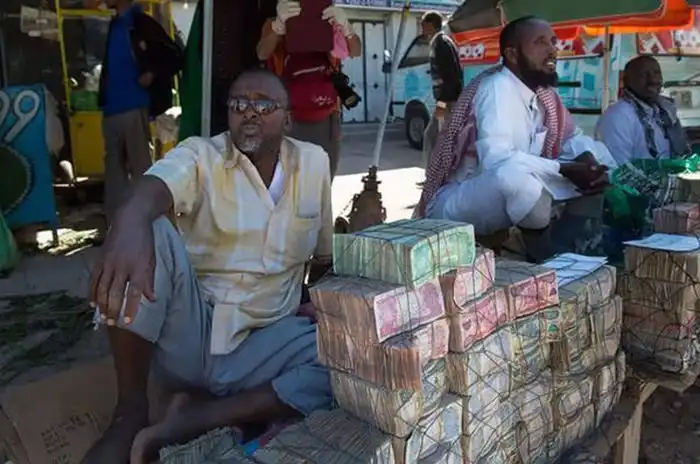 Эти фото сделаны в африканском государстве Сомали во втором по величине городе Харгейса, столице непризнанного государства Сомалиленд. Мужчины на так называемом денежном рынке предлагают местную валюту, сомалилендский шиллинг, в обмен на доллары. Неофициальный курс обмена 9000 шиллингов за 1 доллар США.