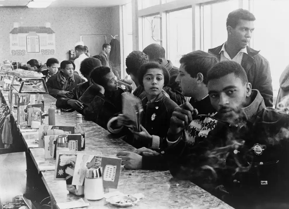 Сидячая забастовка в ресторане Toddle House, в Атланте, штат Джорджия. В помещении на фото: Тейлор Вашингтон, Айвенго Дональдсон, Джойс Лэднер, Джон Льюис за Джуди Ричардсон, Джордж Грин и Чико Неблетт. (Дэнни Лион / Библиотека Конгресса)