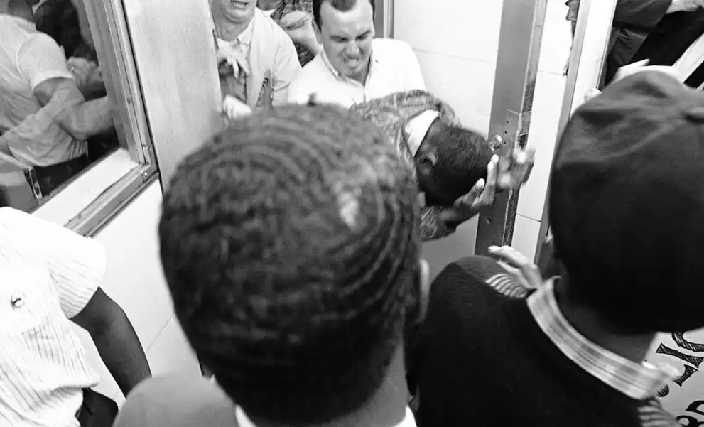 Нью-Йорк, конфликт полицейских с демонстрантами на станции метро в день открытия Нью-Йоркской Всемирной выставке, 22 апреля 1964 года. Юноши в качестве формы протеста за гражданские права чернокожих пытались остановить поезд, который ехал из города в торгово-выставочный центр. (AP Photo / Charles Gorry)