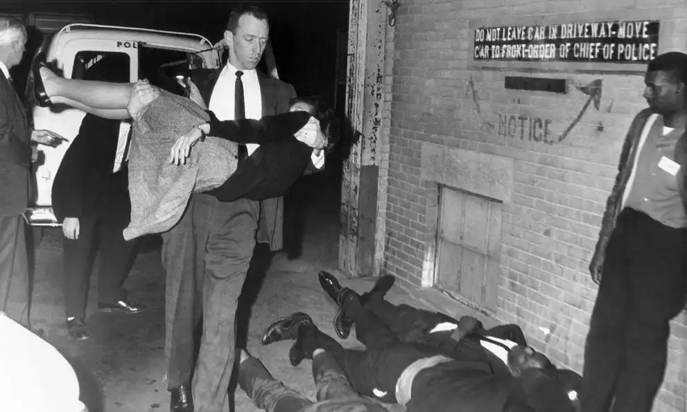 Полицейский несёт молодую девушку мимо трех демонстрантов за гражданские права, лежащих на земле, Тулса, штат Оклахома, полицейский участок, 2 апреля 1964 года. Часть демонстрантов в количестве 54 человек были арестованы в ресторане Tulsa. Некоторые члены этой группы протестантов от Конгресса расового равенства, вследствие полученных при арестах травм, не могли самостоятельно идти и просили офицеров помочь им дойти от ресторана до автозака. (AP Photo)