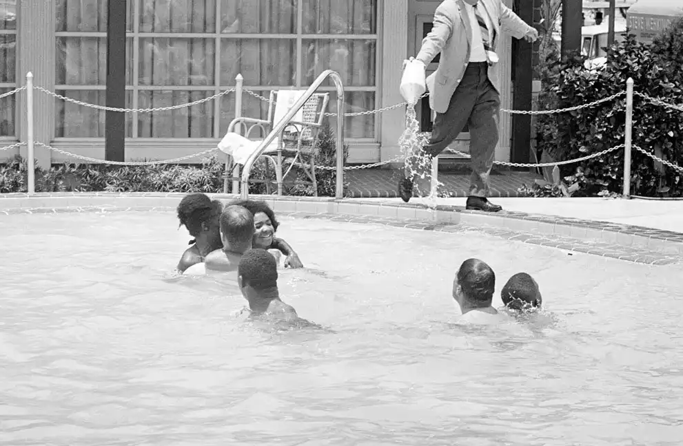 (2 из 2) Когда группа белых и афро-американских сторонников интеграции заняли бассейн гостиницы, менеджер Джеймс Брок вылил в него кислоту со словами: "Я чищу бассейн!", Санкт-Августин, штат Флорида, 18 июня 1964 года. (AP Photo / JK)