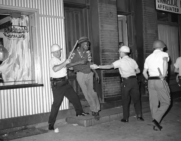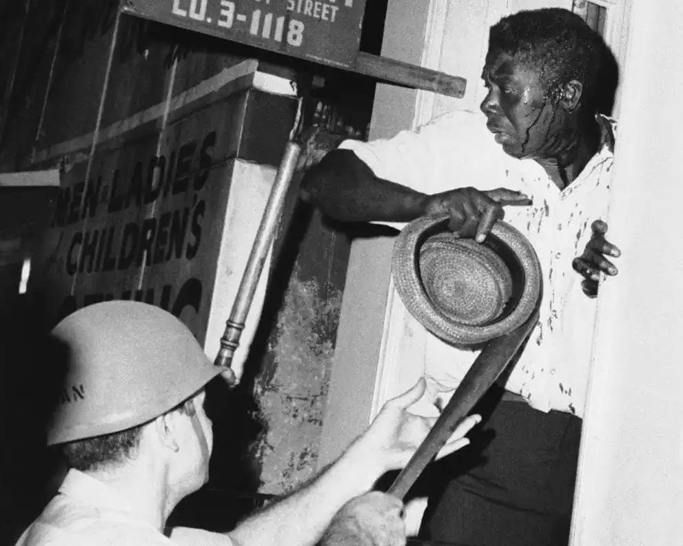 Человека с окровавленными лицом и рубашкой полицейский дубинкой выталкивает в дверь, рано утром 30 августа 1964, в Северной Филадельфии, штат Пенсильвания. Человек был избит за отказ выйти. (AP Photo)