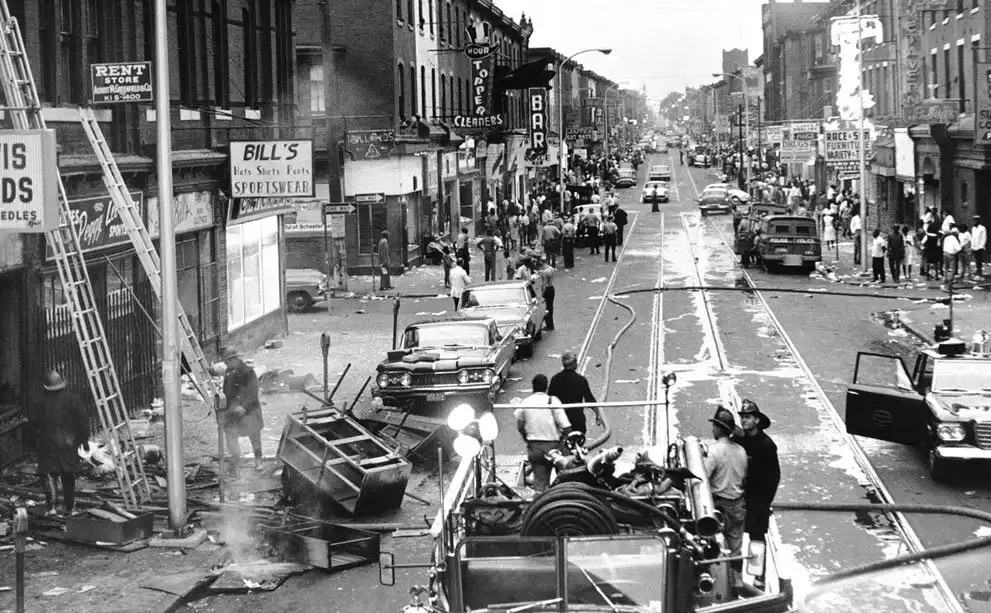 На снимке показана 15th Street на Columbia Ave по направлению к западу. Эта улица подверглась беспорядкам, преимущественно в черном районе Северной Филадельфии, в течение предыдущей ночи и продолжавшимся до 29 августа 1964. Слева, пожарные тушат обломки разрушенного магазина на фоне демонстрантов, прохожих и полицейских вдоль всей улицы. Беспорядки привели к частым случаям мародёрства и тяжёлым повреждениям людей. По крайней мере, 50 человек были ранены, включая 27 полицейских. (AP Photo)