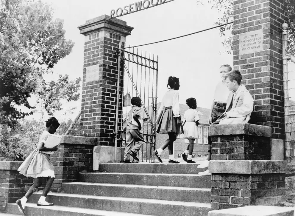Двое белых учеников наблюдают, как негритянские дети входят в, ранее исключительно для белых, начальную школу Rosewood в Колумбии, Южная Каролина, 31 августа 1964 года. (United Press International / Библиотека Конгресса)