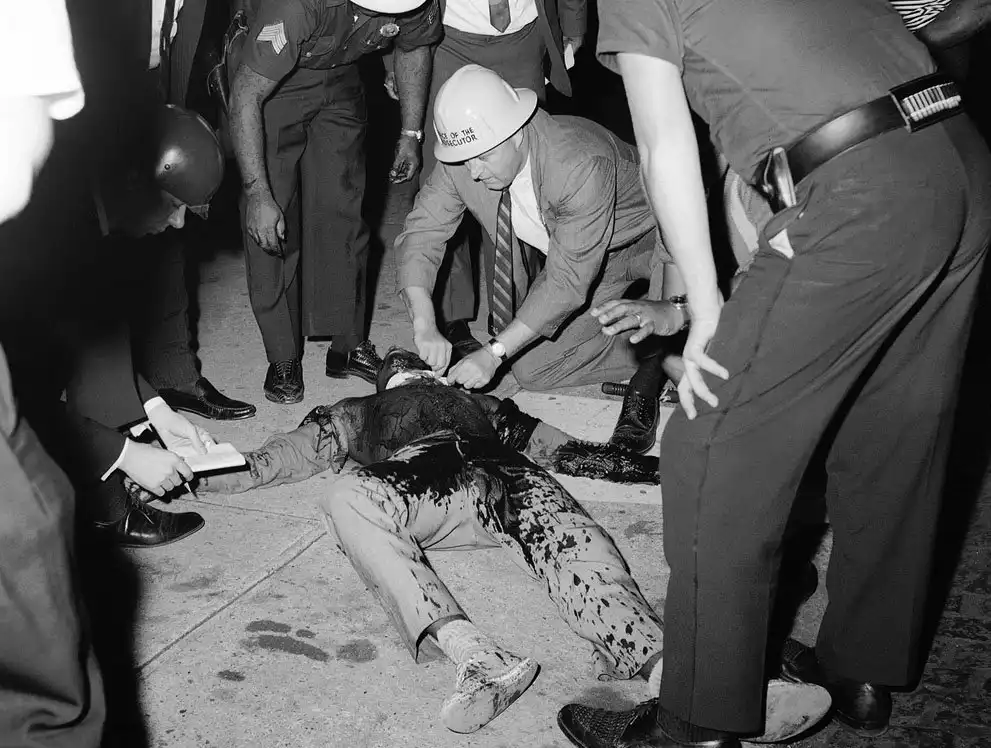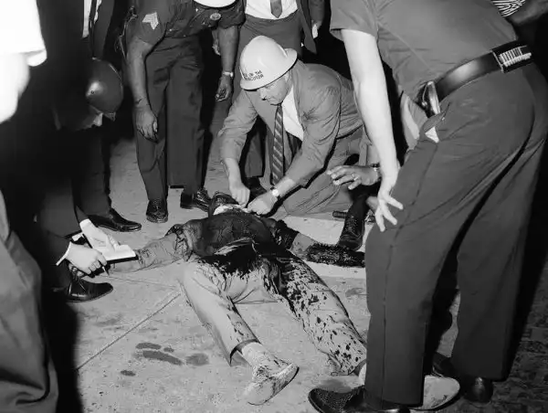 Чернокожий юноша, который был поражён выстрелом в шею или плечо во время вспыхнувшей межрасовой расправы в Джерси-Сити, лежит на тротуаре, в то время как полицейские в касках пытаются оказать ему помощь, 3 августа 1964 года. Юноша, опознанный как Луис Митчелл, был среди группы молодых людей, находившейся рядом со строящимся домом и бросавшейся предметами в полицейских. Каким образом юноша был застрелен, так и не определили. Также, по крайней мере, еще один житель был застрелен и несколько полицейских и бунтовщики получили ранения в результате взрыва. (AP Photo)