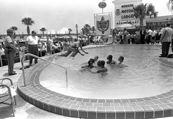 (1 из 2) Когда группа белых и черных сторонников интеграции отказались покинуть бассейн мотеля в Санкт-Августине, штат Флорида, человек на снимке нырнул, чтобы выгнать их оттуда, 18 июня 1964 года. Все они были арестованы. (AP Photo / Гораций Корт)