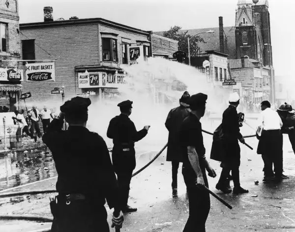 Нью-Йорк, пожарные, при поддержке полиции, разгоняют протестующих из пожарных шлангов, в Рочестере, штат Нью-Йорк, 25 июля 1964 года, в рамках операции по наведению порядка на улицах города. В отчётах отмечалась жестокость полиции во время разгона бунта в Рочестере 24 июля, который продолжался несколько дней. (AP Photo)
