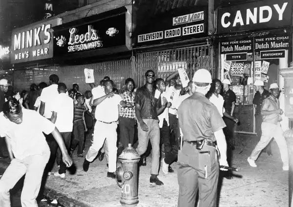 15 июля 1964 года, 15-летний афроамериканец по имени Джеймс Пауэлл был застрелен в Нью-Йорке лейтенантом полиции Томасом Гиллиганом. Это привело к беспорядкам на улицах Гарлема, когда бунтовщики вышли с портретами убийцы Гиллигана. В результате хаоса, который продолжался шесть дней, один человек погиб, 118 - получили ранения и более 450 были арестованы. (Дик Де Marsico / Всемирного Телеграмма & Sun / библиотека Конгресс)