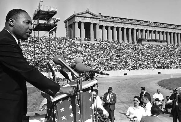 Преподобный Мартин Лютер Кинг обращается к собравшимся, по оценкам до 70000, на митинге за гражданские права на стадионе-мемориале Солдатское поле в Чикаго, 21 июня 1964 года. Кинг сказал на митинге, что одобрение Конгрессом закона о гражданских правах предвещает "Рассвет новой надежды для негров". (AP Photo / Charles E. Knoblock)