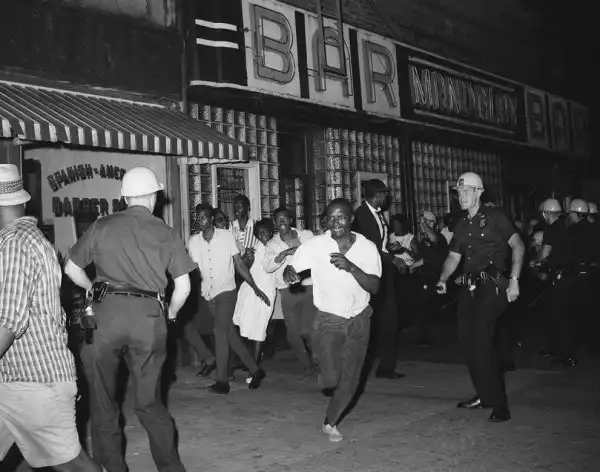 Жители Гарлема, Нью-Йорк, бегут от вооружённой дубинками полиции, пытаясь выйти и собраться на улицах, 19 июля 1964 года. Такие протестные настроения общества с 18 по 19 июля были приурочены к похоронам Джеймса Пауэлла 19 июля. (AP Photo)