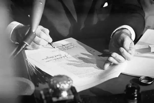 Президент Линдон Джонсон подписывает законопроект о гражданских правах в Восточном зале Белого дома в Вашингтоне 2 июля 1964 года. Закон был направлен против дискриминации по признаку расы, цвета кожи, религии, пола или национальности, а также против неравного избирательного права и расовой сегрегации в школах, на рабочих местах и местах общественного пользования. (AP Photo)