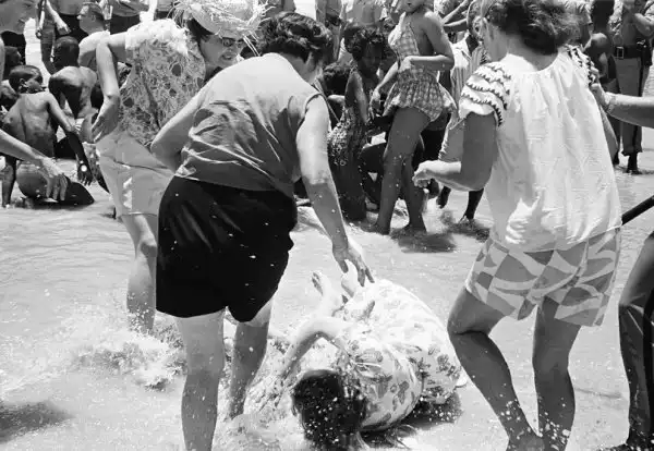 (2 из 4) Группа белых сторонников сегрегации атакуют группу чернокожих, когда они начали плавать в море, Санкт-Августин-Бич, Флорида, 25 июня 1964 года. Полиция разогнала это столкновение. (AP Photo)