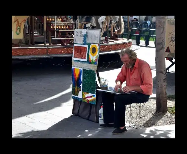Далее по курсу – старый воин психоделической революции, созидающий свои творения на глазах у Бога и у клиента, разместившийся рядом с любимым всеми французскими ганджаманами развлечением – каруселью с разными огоньками, как в старину, всё ещё радующей французских жителей на улицах городов.