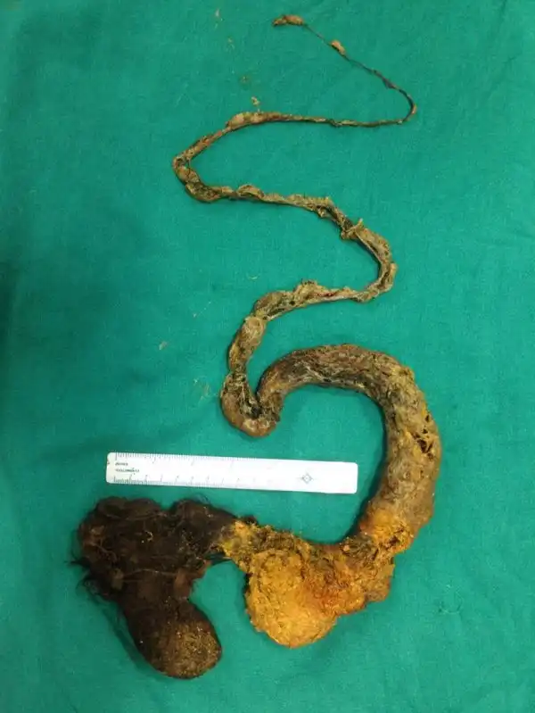Индийский мальчуган Сивам Кумар ел собственные волосы на протяжении девяти месяцев. Это привело к тому, что он больше не смог вообще ничего съесть, так как в пищеварительном тракте образовалась пробка. В результате операции из пацана достали метровый кусок сплетенных волос. Чтобы прецедент не повторился, малого побрили налысо.