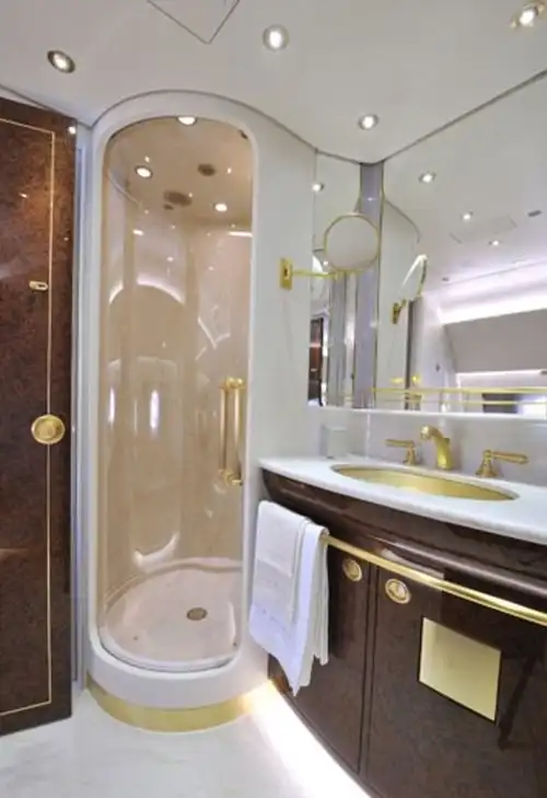 В США супруги полетят на авиалайнере, который был доработан в Париже. Вместо 180 посадочных мест этот самолет рассчитан всего на 26 человек. Внутри есть большая спальная комната с кроватью, комната для отдыха, столовая, небольшой бар и душевая. В отделке использованы ценные породы древесины, высококачественная кожа и даже элементы из золота.
