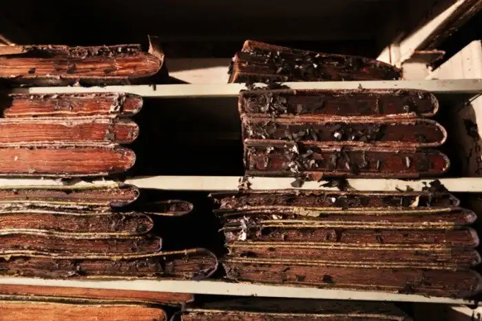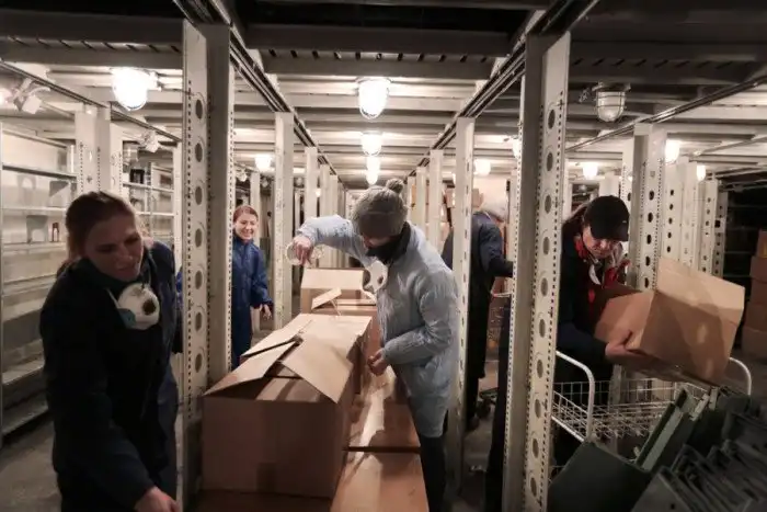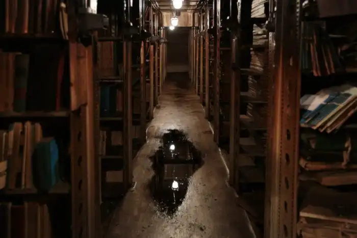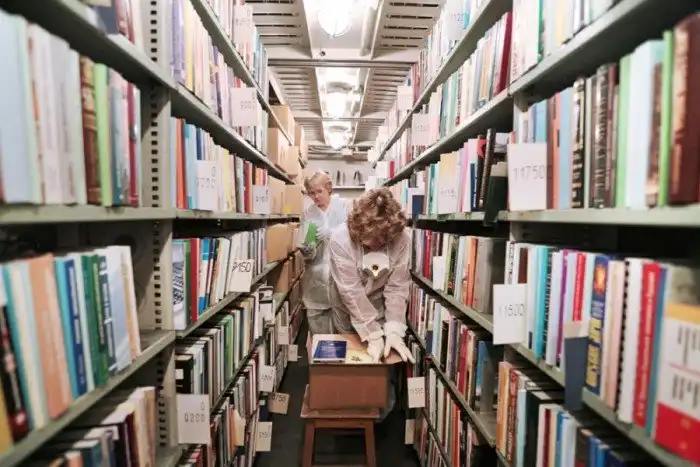 Потом настала очередь эвакуации мокрых книг. Только за 4 дня было вывезено 80 тонн книг, ежедневно вывозят по 20 – 30 тонн книг. Мокрые книги помещают в пластиковые ящики, а затем отправляют в криокамеры, где они ожидают своей очереди на сушку. Сгоревшие экземпляры пока не трогают. Всего будет вывезено порядка 1,5 тысяч тонн книг.