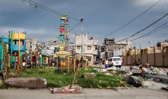 Кое-где среди гор грязи и мусора работают аттракционы и игровые площадки.