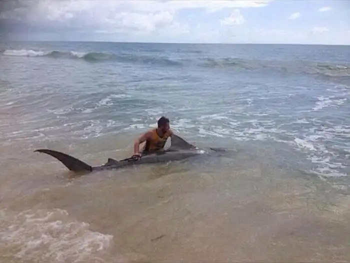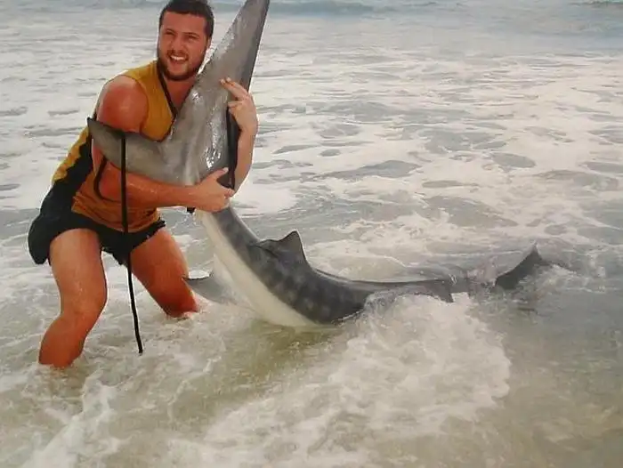 В субботу 4 апреля на пляже Потсвилла, Австралия, 19-летней парень Макс Магеридж поймал на удочку 4-метровую тигровую акулу. Ранним утром он со своей девушкой пришел отдохнуть на пляж и решил забросить удочку. Клева не было, и Макс уже собирался уходить, как заметил, что кто-то все же попался на его крючок. Вытащить улов на берег оказалось не просто. Только спустя час молодой рыбак увидел свой улов, который выпрыгнул из воды. А еще после двух часов борьбы Макс сумел вытащить хищницу на берег, причем сделал это голыми руками.