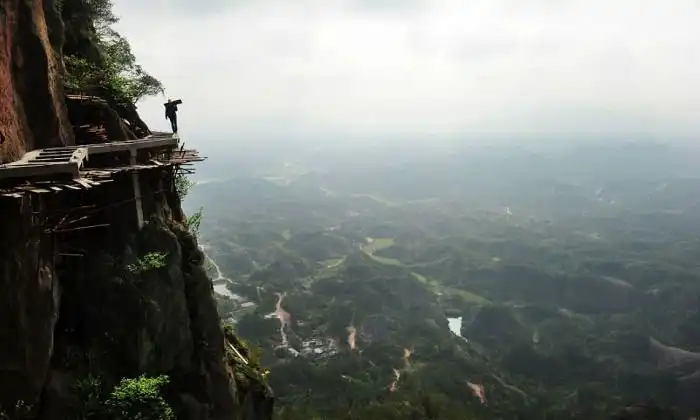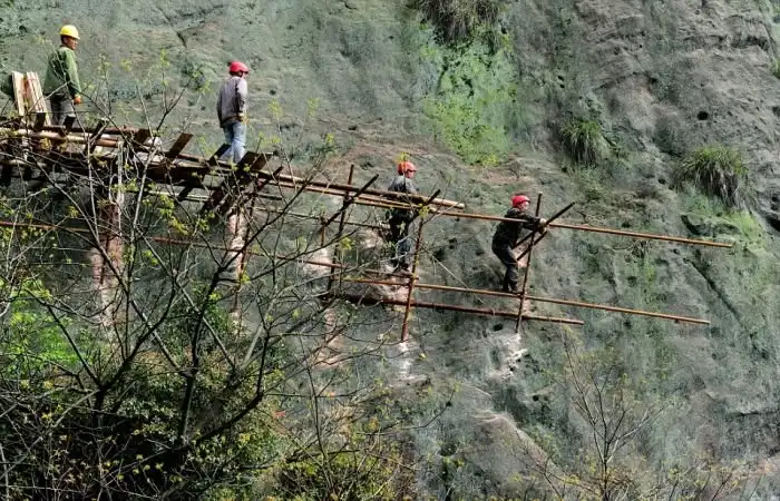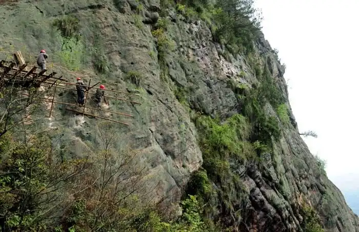 В китайской провинции Хунань в округе Пинцзян, где находятся популярные среди туристов горы Tianmen и знаменитый стеклянный мост, начался ремонт горной тропы. Ветхую конструкцию, проходящую по склону высокой горы, укрепляют и расширяют, чтобы в скором времени по ней прошел очередной пеший маршрут для прогулок туристов. Удивительно, что сами рабочие совершенно не используют никакой страховки, а единственной мерой безопасности при работе на высоте является каска.