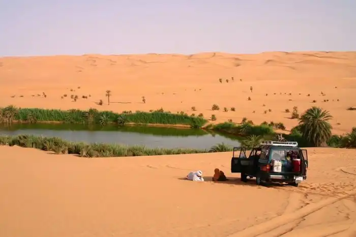 На юго-западе Ливии в муниципалитете Вади-эль-Хаят посреди бескрайней пустыни находится оазис Убари, который также называют песчаным морем. Двести тысяч лет назад на месте песков были плодородные земли, а по ним текли небольшие реки, впадавшие в огромное озеро Мегафеццан. Со временем вода в озере стала испаряться, и от него осталось лишь несколько десятков мелких озер, некоторые из которых походят на лужи. Вода в этих озерах очень соленая, но, тем не менее, они являются единственным источником жизни для растений, облюбовавших берега этих озер.