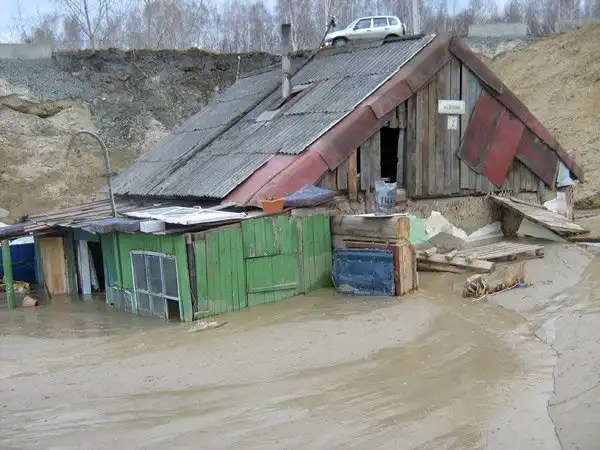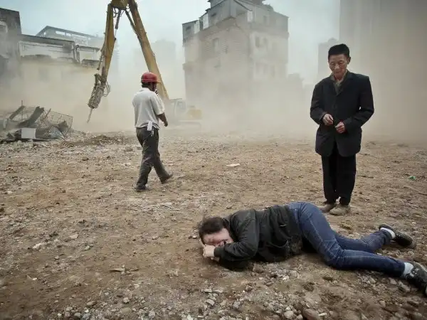 Владелец частично разрушенного дома на строительной площадке в провинции Куньмин, собирает воду около своего жилища, так как водоснабжение было прекращено. 2010 год