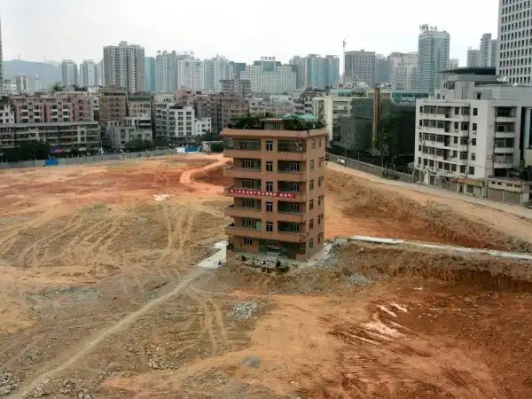 Шестиэтажный жилой дом на строительной площадке в Шэньчжэне. Владелец Чой Чу Чун и его жена Чжан Лянь Хао отказались принять компенсацию за снос их дома.
