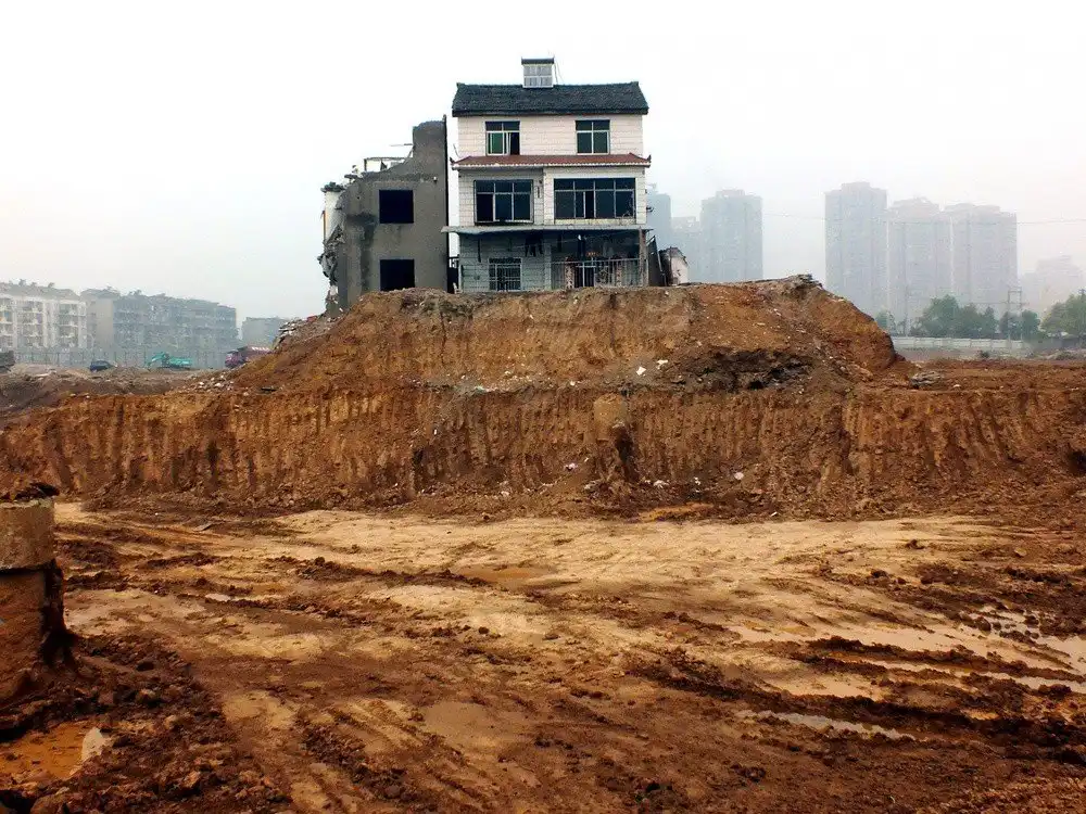 Пожалуй, самый известный дом-гвоздь. Пожилая пара отказалась подписать соглашение о сносе дома. В результате половину дома снесли, а оставшуюся часть окружила дорога. Провинция Чжэцзян.