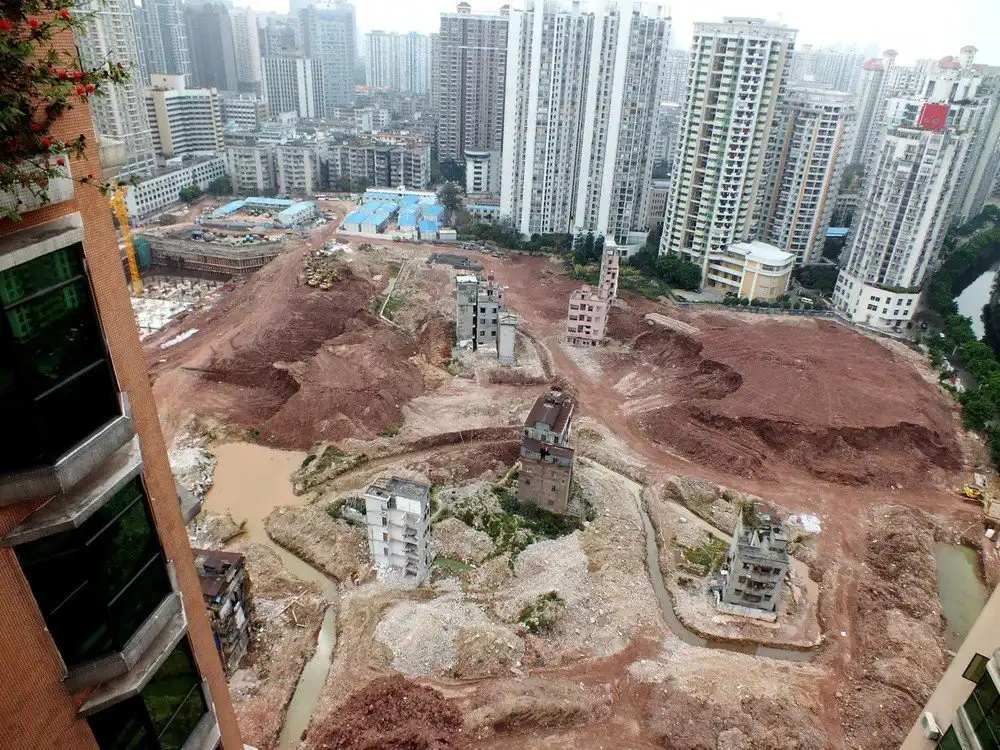 Несколько одиноких домов среди небоскребов, окруженные каналами с водой. Перехавшие жители специально вырыли их, чтобы заставить непокорных покинуть свои дома. Янцзы в провинции Гуанчжоу, 2014 год.
