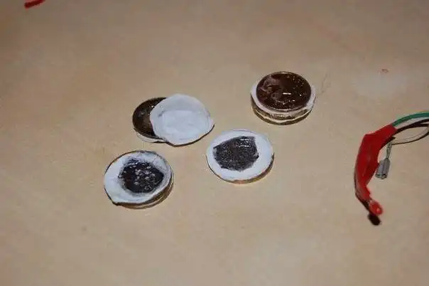 Для изготовления батарейки сначала нужно очистить чистящим средством монеты. Далее обвести на фольге и салфетке 6 кружков и вырезать их. Осторожно зачистите концы проводов кусачками или ножом. Закрутить жилки. Прикрепить один провод к монете изолентой (скотчем), а другой – к кружку фольги. Погрузить бумажный кружок в тёплый солёный раствор. Потом положить провод с кружком фольги в блюдце. На него наложить мокрый бумажный кружок, сверху положить монету. Наложить ещё несколько слоёв из фольги, влажной бумаги и монет. Сверху положить монету с проводом. Батарейка готова!