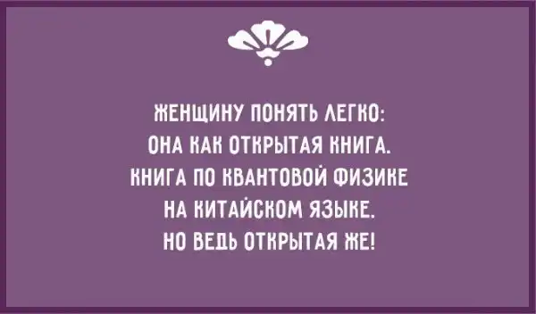 Как говорится, есть только два способа понять женщину, но никто их не знает. О женской сущности, непредсказуемости и легендарной логике сложены множество историй, мифов и анекдотов. Ведь пока вы пытаетесь понять женщину, она уже передумала. Но всё равно мы их любим и не перестанем предпринимать попытки понять их.