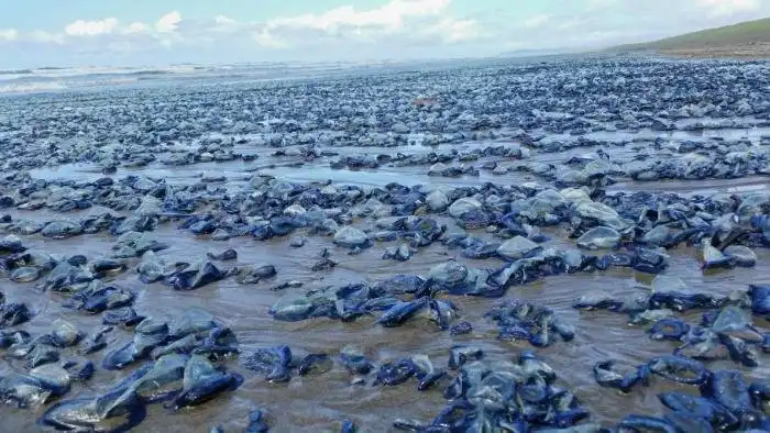 В последние недели океан выбросил на побережье американских штатов Калифорния, Орегон и Вашингтон более миллиарда медуз Velella velella, которых также называют «пурпурными моряками». В поисках пищи животные, имеющие некое подобие паруса, всплывают на поверхность и дрейфуют на волнах, а ветер выбрасывает их на берег, обрекая на практически неизбежную гибель. Берег устлан сине-фиолетовым ковром, состоящим из огромного количества живых и мертвых медуз. По словам специалистов, такое явление происходит примерно раз в несколько лет, однако, сейчас количество выброшенных медуз особенно велико. Кроме того отдыхающим рекомендуют не трогать медуз, так как они могут ужалить.
