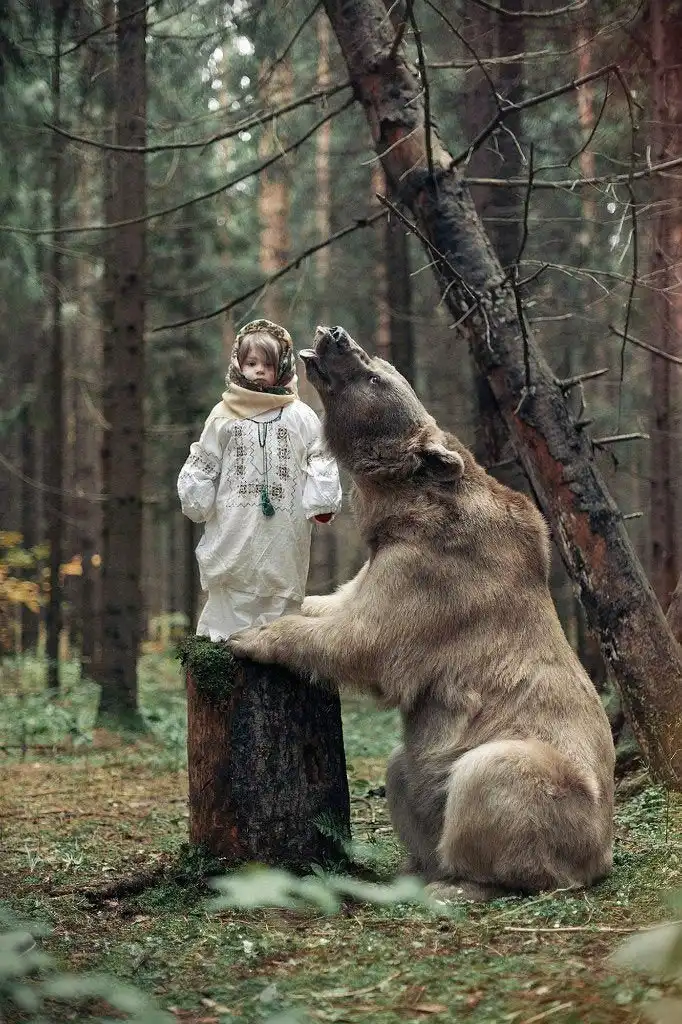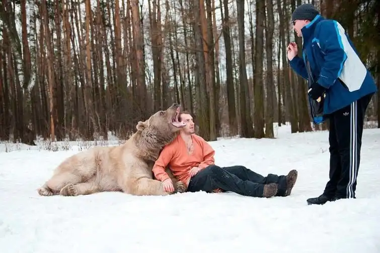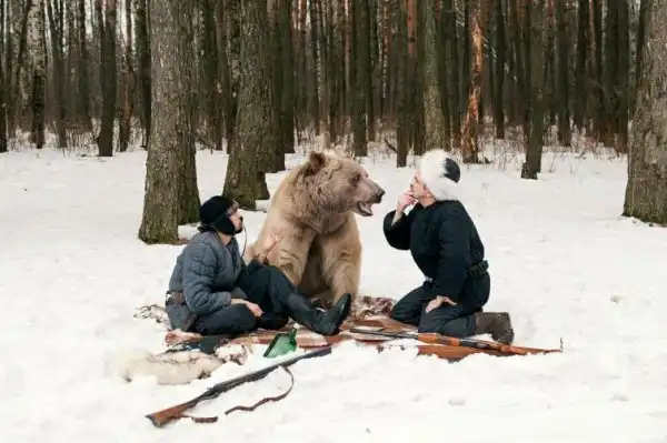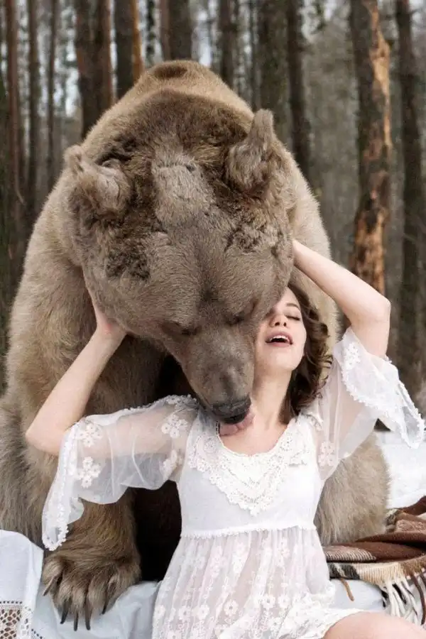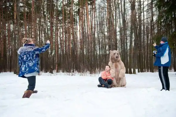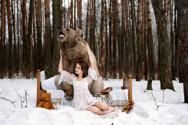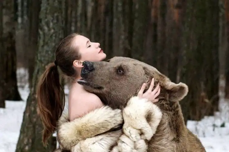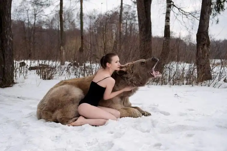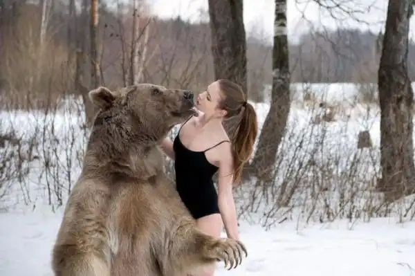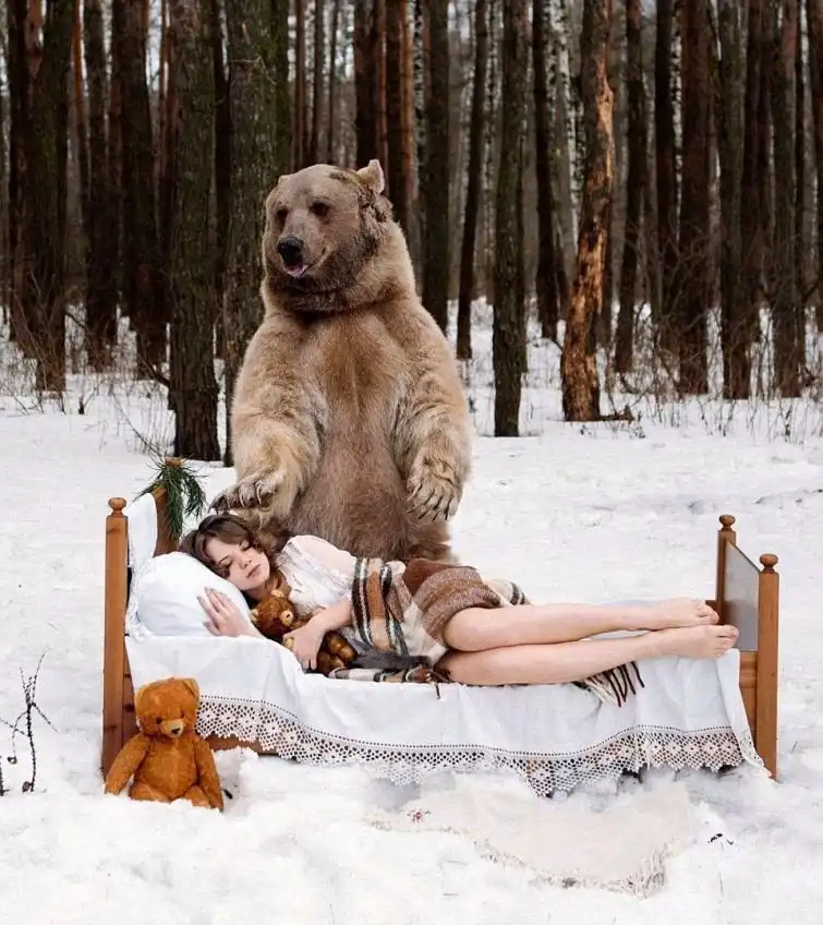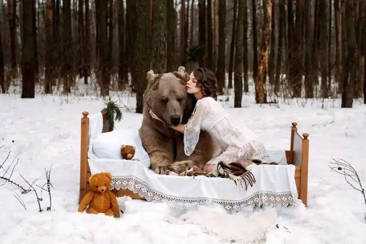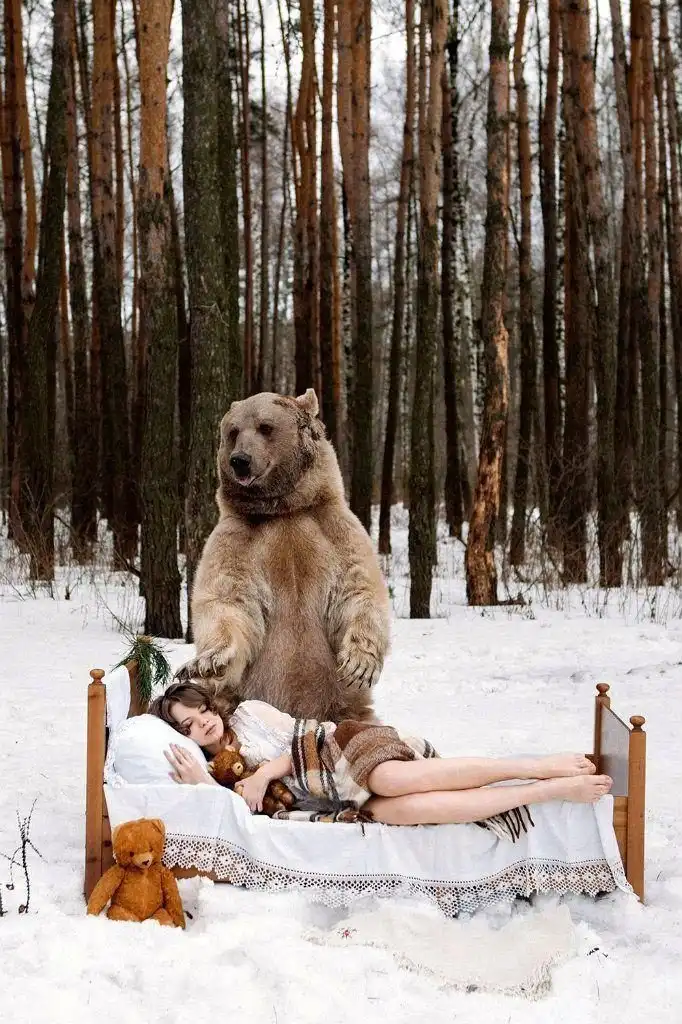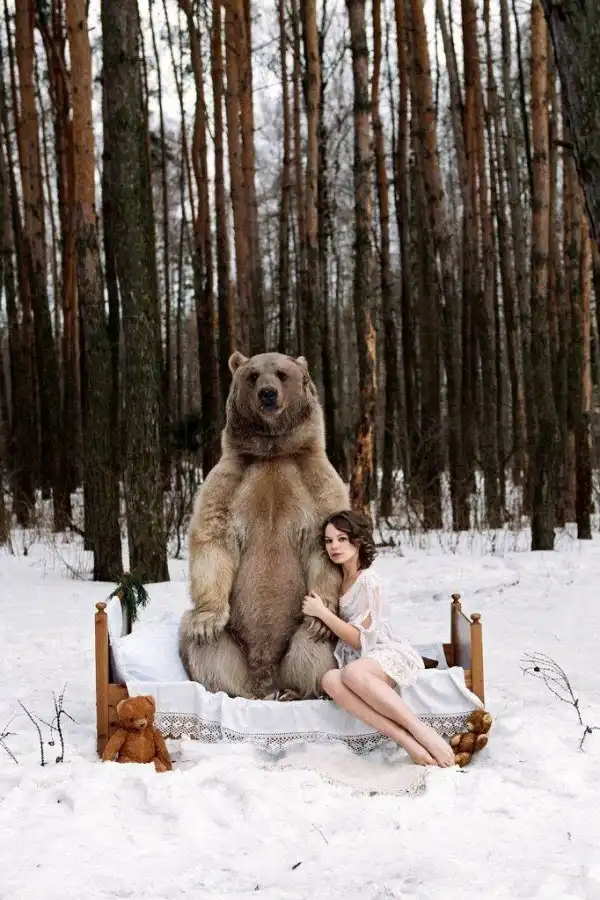 Фотографии моделей с 650-килограммовым медведем в заснеженном лесу