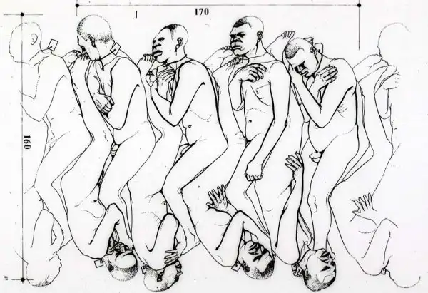 Реконструкция положения рабов, размещенных в трюме судна "Avrora", во время сна в позе под названием "ложка" (1784 год)