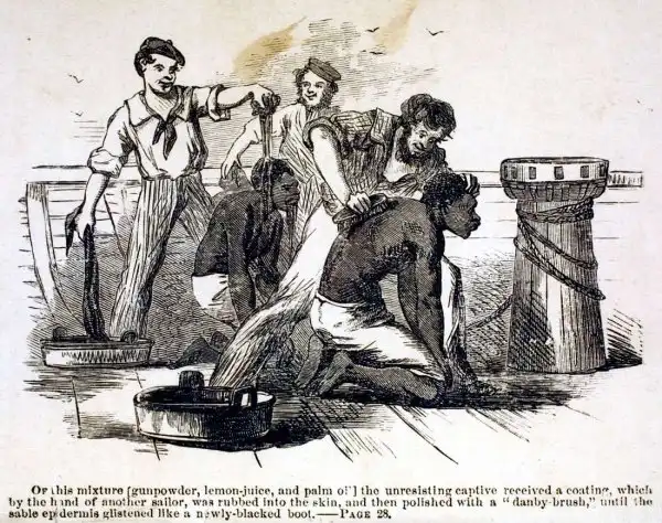 На палубе судна матросы втирают в кожу рабов специальную смесь (из пороха, пальмового масла и лимонного сока)