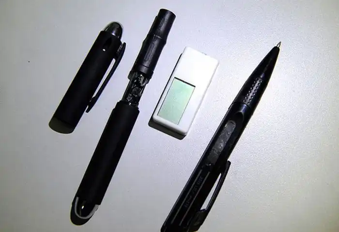 Изъятые у недобросовестных абитуриентов девайсы: скрытая камера в пишущей ручке и приемник, замаскированный под резинку.