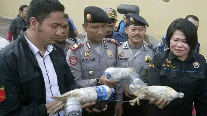 В Индонезии таможенники спасли более 20-ти редких попугаев какаду, которых неизвестные преступники пытались провести через границу в обрезанных 1,5-литровых пластиковых бутылках. Данный вид попугаев (желтохохлый какаду) занесен в международную Красную книгу, а на черном рынке стоимость каждой птицы может доходить до 1000 долларов США. Сразу после обнаружения контрабанды пернатых передали ветеринарам, которые должны их выходить.