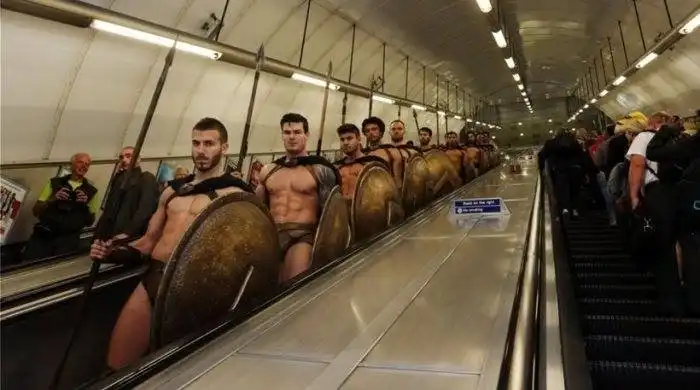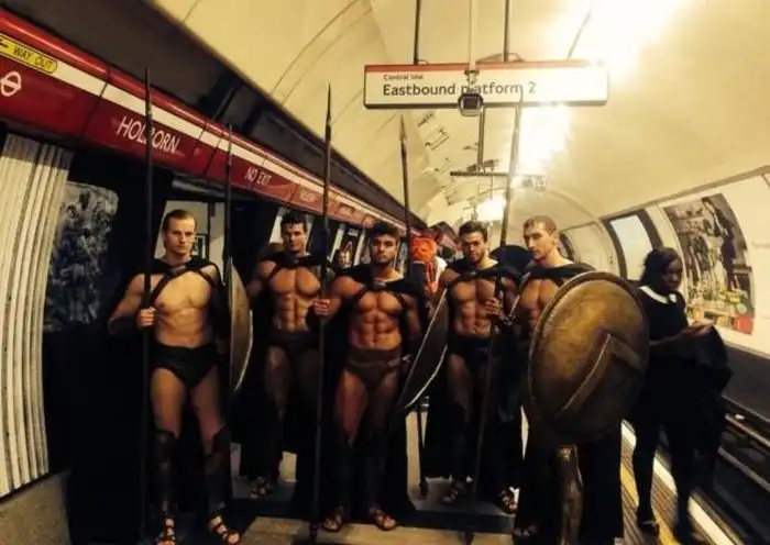 Группа парней атлетического телосложения, вдохновленных акцией «в метро без штанов» (The No Pants Subway Ride), в образе древних воинов прокатилась в метро Лондона, вызвав тем самым всеобщий восторг у представительниц слабого пола.