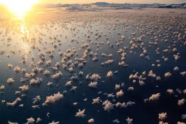 На спокойных водах озер и морей, когда поверхность только-только схватывается легкой коркой льда, в условиях резких похолоданий (около — 22 по Цельсию) возникают кристаллы свежего льда дивной формы.