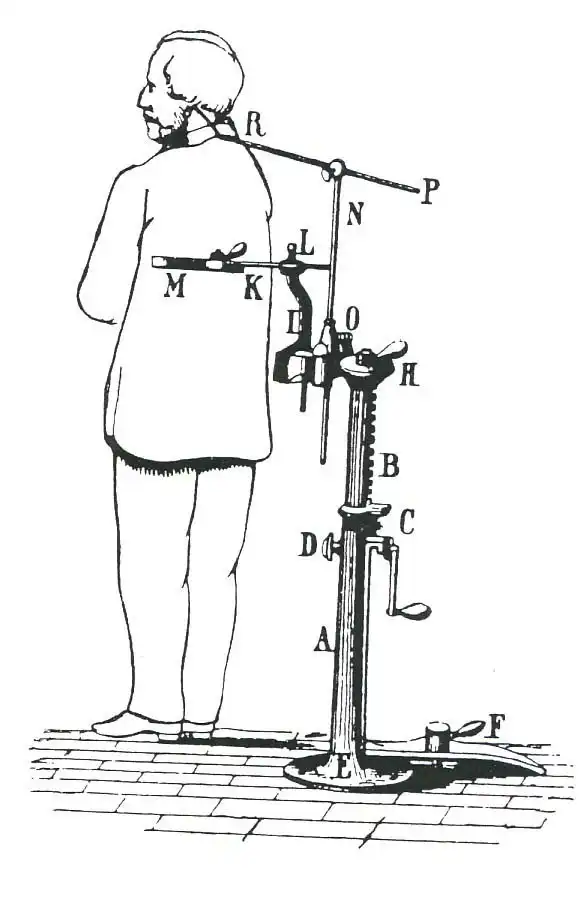 Фото мёртвой женщины, сделанное при помощи удерживающего её тело специального устройства