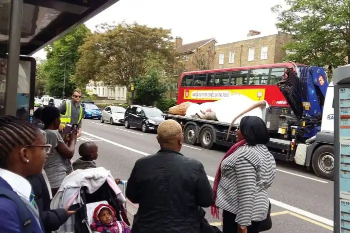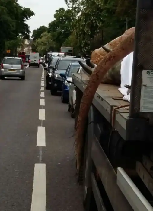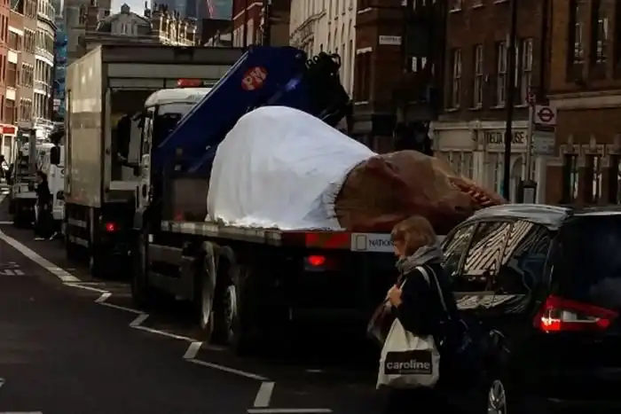 Сегодня днем жители Лондона могли наблюдать довольно реалистичного 15-метрового тираннозавра, которого перевозили на грузовике. Макет древней рептилии, обитавшей на нашей планете около 60 миллионов лет назад, был прикрыт белой тканью, однако, его голова, лапа и хвост выглядывали из-под нее. Куда везли хищника, неизвестно, но многие очевидцы не упустили возможности сфотографироваться с ним.